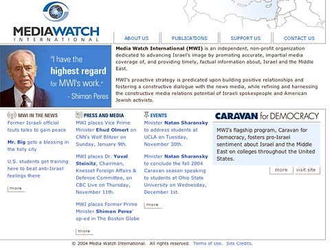 Media Watch International is a pro-Israel propaganda group “dedicated to advancing Israel’s image” in the media world and on U.S. campuses, according to its website at www.mwio.org. The flagship program of Media Watch International, “Caravan for Democracy,” “fosters pro-Israel sentiment about Israel and the Middle East on colleges throughout the United States,” according to its website.