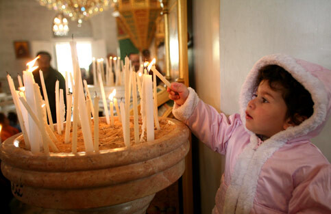 A Palestinian Christian child lights a candle during a Palm Sunday procession at the Nativity Church in the West Bank city of Bethlehem, 1 April 2007. (Haytham Othman/MaanImages)