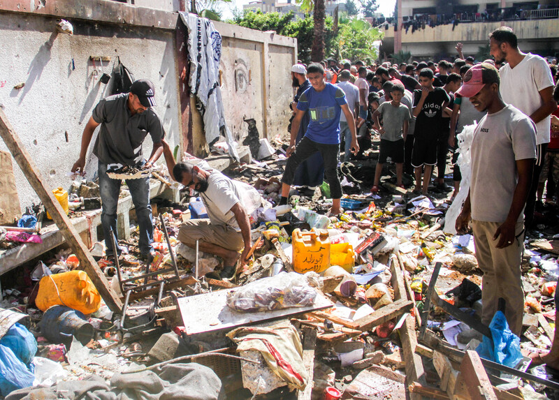 Palestinians gather at the site of an Israeli strike on the Hafsa al-Faluja School, which had been transformed into a shelter for displaced people. Israel killed 15 people in its attack on the school on 26 September 2024.