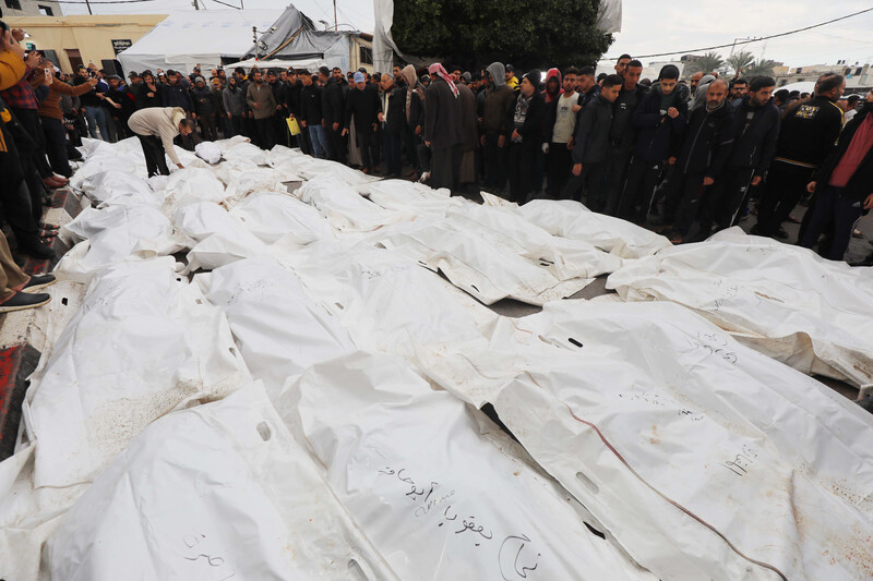 A somber atmosphere prevails at al-Aqsa Martyrs hospital in nearby Deir al-Balah. The bereaved have been coming to the hospital so that they can pay their final respects to the victims of the massacre.
