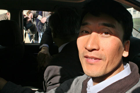 French Iranian-born photographer, Alfred Yaghobzadeh (L), and French journalist Caroline Laurent smile after they were released by gunmen in Gaza March 15, 2006. (MaanImages/Wesam Saleh)