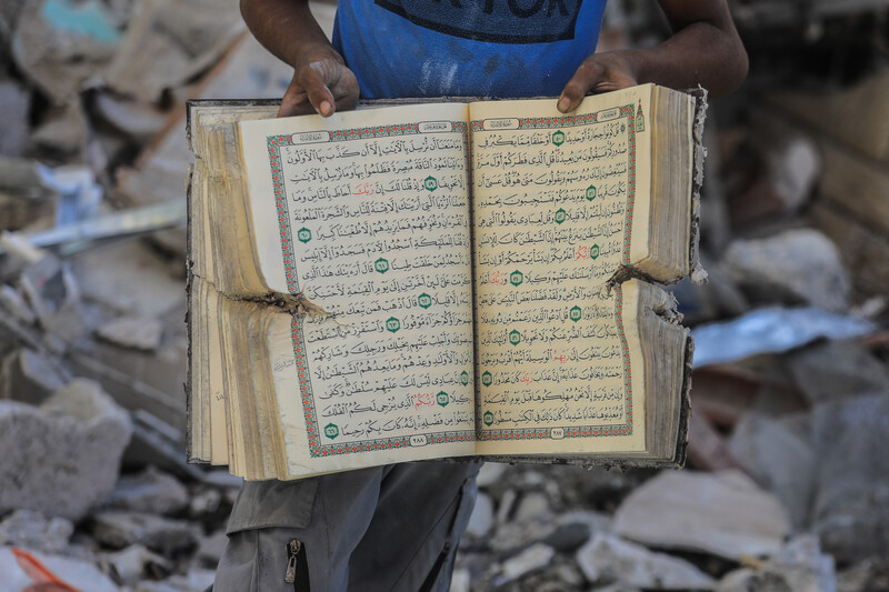 A man holds up a Quran salvaged from the rubble of the Khalid ibn Walid mosque in Khan Younis, which was targeted in an Israeli bombing in November 2023.