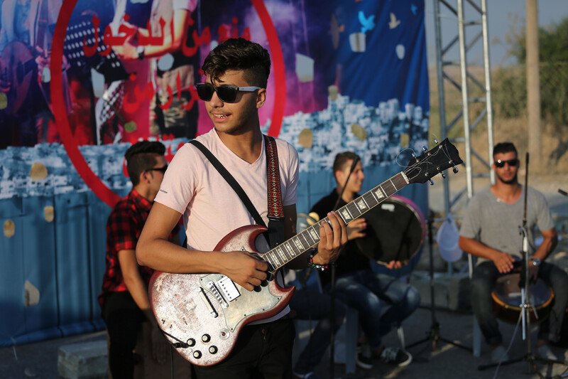 The band Dawaween, denied permission to travel from Gaza to Jerusalem where they were scheduled to perform, give a concert as part of a protest in Beit Hanoun, near the Erez checkpoint with Israel, northern Gaza Strip, 6 August.