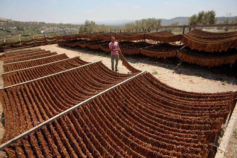 A Palestinian man carries dried tobacco leaves at his field in the West Bank village of Yabad, near Jenin, on 7 August.