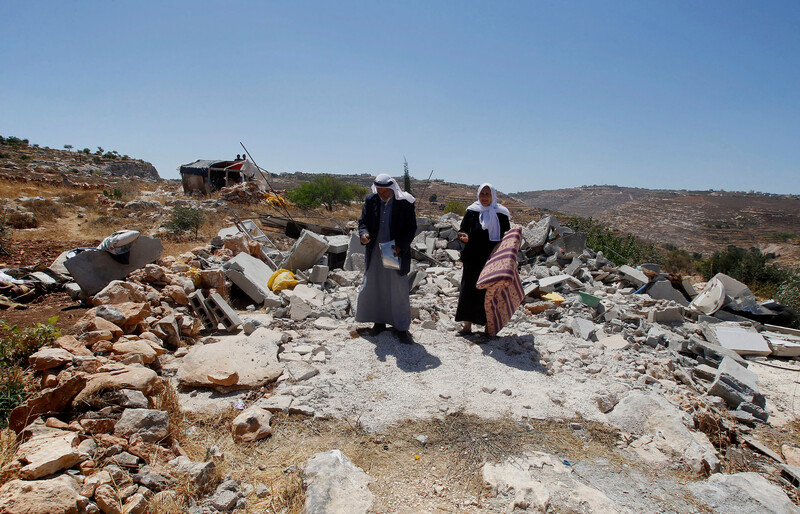 Palestinians stand on the ruins of their home after Israeli troops demolished it in the West Bank village of Sair, near Hebron, on 16 August.