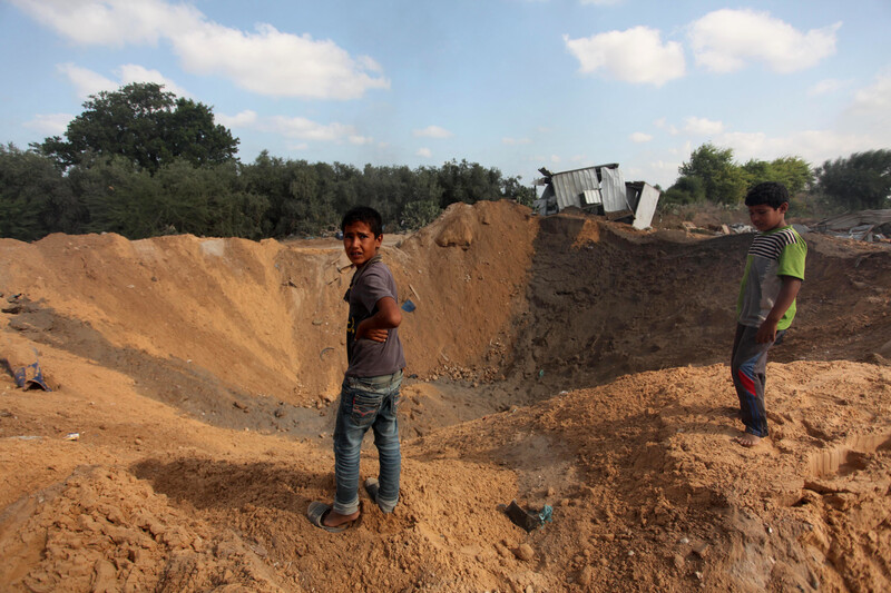 Palestinian children stand next to a crater in Beit Lahiya, northern Gaza Strip, following an Israeli airstrike in response to a rocket fired from Gaza which crashed into the Israeli town of Sderot, 22 August.