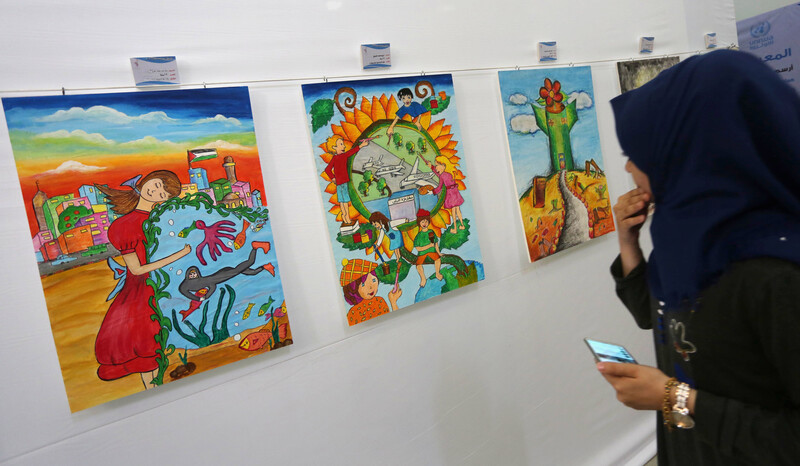 Palestinians attend an exhibition of drawings for the “Draw Your Dream for Gaza 2020” competition organized by UNRWA, the United Nations agency for Palestine refugees, in Gaza City on 23 August. For the contest, students from grades four to six were were asked to draw their dream for Gaza in 2020, by which time the UN warns Gaza will no longer be livable under current conditions.