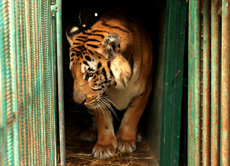 A tiger named Laziz stands in its enclosure before being taken out of Gaza by Four Paws International along with other animals at a zoo in Khan Younis, southern Gaza Strip, on 23 August. Multiple Israeli attacks and nearly a decade of siege proved devastating for the zoo, which opened in 2007. Surviving animals were evacuated from the zoo after its owner said he was no longer able to properly care for them.