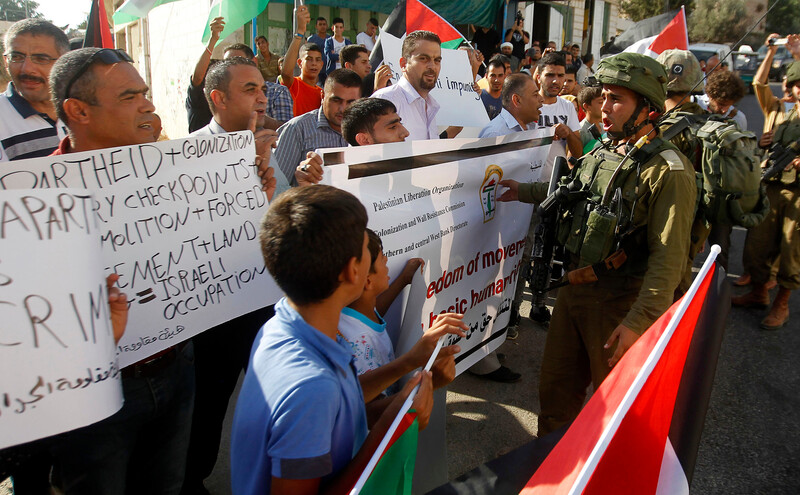 Palestinians call for the opening of Shuhada Street, the former commercial heart of the West Bank city of Hebron, on 24 August. The Israeli army has shuttered and closed Shuhada Street to Palestinians since 1994 after the massacre of 29 Palestinian worshippers inside the Ibrahimi mosque by American Jewish settler Baruch Goldstein that same year.
