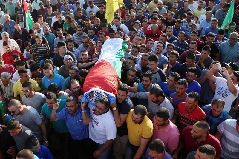 Mourners carry the body of Iyad Hamad, a 38-year-old father who was shot and killed by Israeli forces near a military post outside the West Bank village of Silwad, near Ramallah, during his funeral on 26 August. The army admitted that Hamad was unarmed and posed no danger when he was slain.