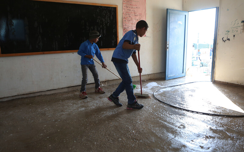 Students clean their classroom at Arab al-Kaabneh school in al-Muarrajat area near the West Bank city of Jericho on 28 August, the first day of the new school year. The school is one of several structures in the Bedouin community built over the objections of the Israeli military occupation authorities, who refused to issue construction permits and threaten to demolish the structures.