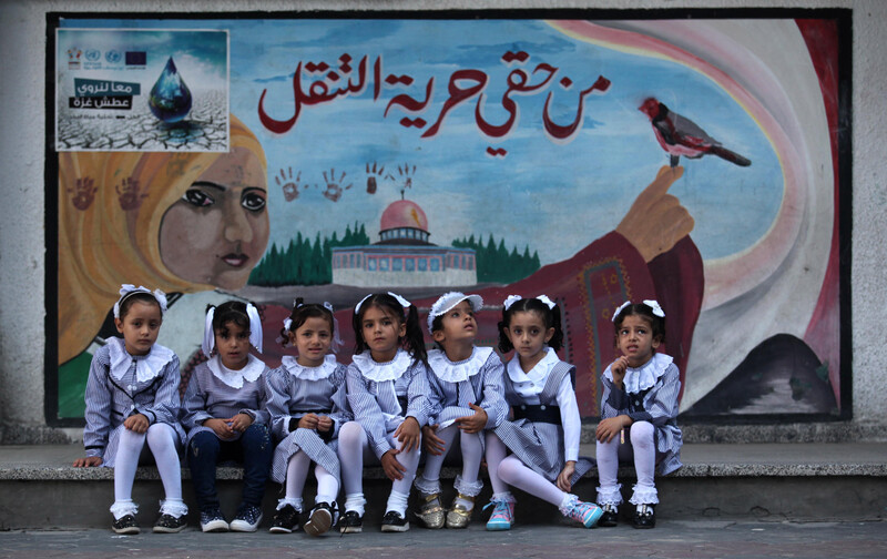 Palestinian girls sit in front of a mural reading “Freedom of movement is my right” on the first day of the new academic year at the United Nations-run school in Khan Younis, southern Gaza Strip, on 28 August.