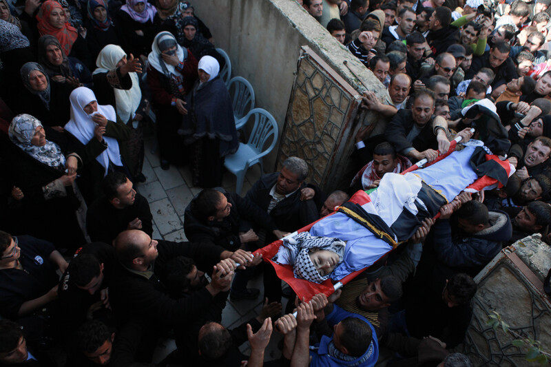 Mourners carry the body of seventeen-year-old Imam Dweikat during his funeral in the West Bank village of Baita, near Nablus, on 30 December. The Palestinian boy was killed by Israeli soldiers during confrontations near Tapuah settlement