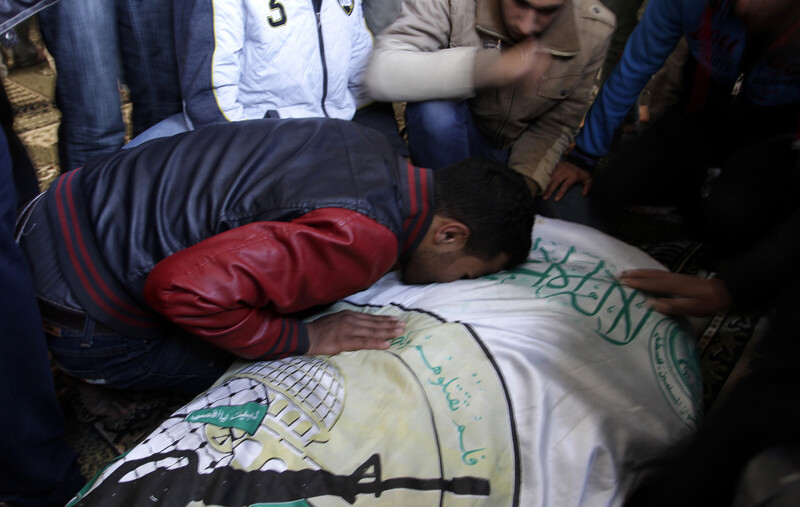 Relatives mourn over the body of Tayseer Asmairi during his funeral in Khan Younis, southern Gaza Strip, on 24 December. Israeli forces shot dead Asmairi, a member of Hamas’ armed wing, after a firefight reportedly erupted along the Gaza-Israeli boundary.