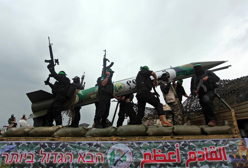 Members of the Qassam Brigades, the armed wing of Hamas, display weapons during a military parade in Gaza City marking the 27th anniversary of Hamas’ founding, 14 December.
