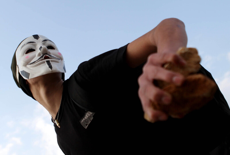 A Palestinian protester throws stones at Israeli troops during confrontations near Ofer military prison near the West Bank city of Ramallah on 12 December.