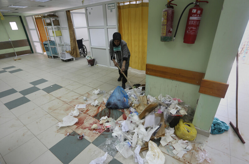 An employee of the dismissed Hamas government in the Gaza Strip works at al-Shifa hospital in Gaza City as cleaning workers went on strike to demand payment of their salaries by the national unity government in the West Bank city of Ramallah, 4 December.