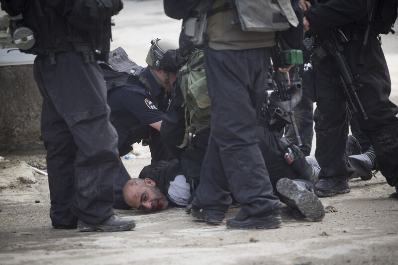Israeli police arrest a Palestinian man as occupation authorities bulldozed Palestinian-owned shops under the pretext that they were built without a permit in Shuafat refugee camp near Jerusalem, 3 December. Palestinians in Jerusalem rarely receive building permits due to systematic discrimination.