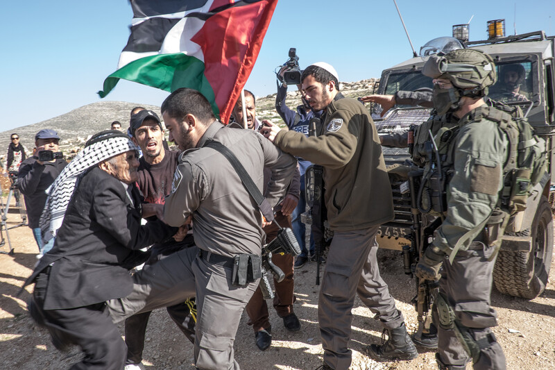 An Israeli soldier kicks an elderly Palestinian man during a protest marking International Human Rights Day in the village of Turmus Aya near the West Bank city of Ramallah on 10 December. Palestinian minister Ziad Abu Ein died during the protest after being beaten by Israeli forces and suffering tear gas inhalation.