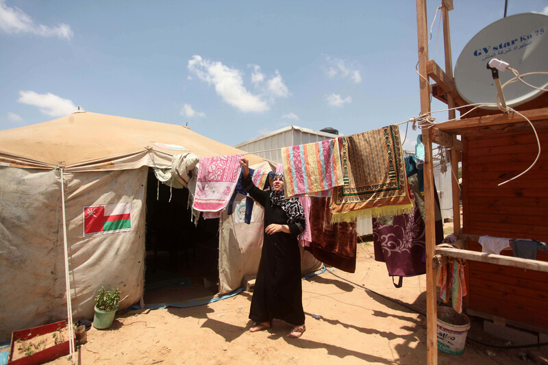 A Palestinian woman hangs laundry near the ruins of her house that was destroyed by Israeli shelling last summer, Khan Younis, southern Gaza Strip, 2 July.