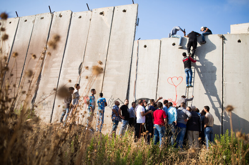 Palestinians climb over the Israel’s wall in the Jerusalem-area town of al-Ram attempting to pray at al-Aqsa mosque on the third Friday of Ramadan, 3 July.