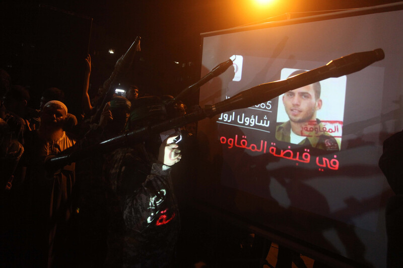 Fighters with the Qassam Brigades display a photo of an Israeli soldier killed in Gaza last summer during a march marking the first anniversary of the 51-day assault, Gaza City, 8 July. Last month Israel lifted a gag order on the recent disappearance of two of its citizens in Gaza.