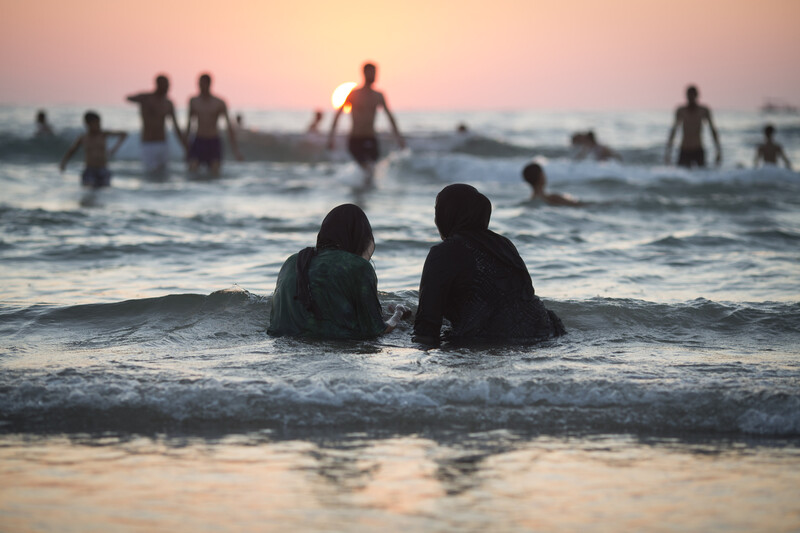Palestinian women enjoy the Mediterranean Sea during the second day of the Eid al-Fitr holiday as the sun sets in Jaffa, 18 July. Israeli authorities issued thousands of permits for Palestinians living in the occupied West Bank, allowing them to visit present-day Israel during the three-day holiday that marks the end of Ramadan.