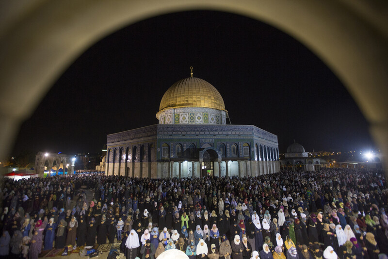 Palestinian worshippers pray during Lailat al-Qadr outside the Dome of the Rock in the al-Aqsa mosque compound in Jerusalem’s Old City on 13 July. In the Islamic tradition, Lailat al-Qadr, which falls during of the month of Ramadan, marks the night that the first verses of the Quran were revealed to the Prophet Muhammad.