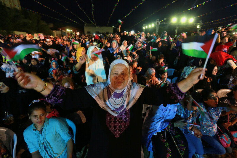 Palestinians celebrate during a mass wedding funded by a charity for 150 couples in Beit Lahiya, northern Gaza Strip, on 20 July.