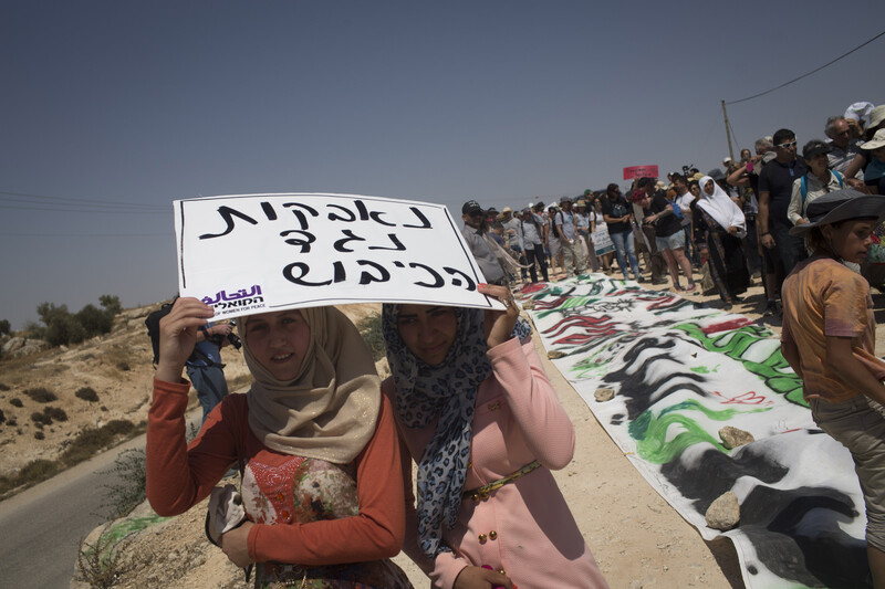 Palestinian, Israeli and international activists march next to the village of Susiya to protest its threatened demolition and the forced transfer of its residents, South Hebron Hills, West Bank, 24 July.