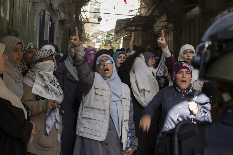 Palestinian women confront Israeli police forces at an entrance to the al-Aqsa mosque compound in Jerusalem’s Old City on 26 July after Israel limited Palestinian access to the holy site following clashes inside the compound.