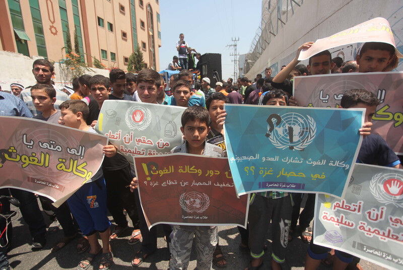 Palestinians protest cuts in services outside the offices of UNRWA, the United Nations agency for refugees, in Gaza City on 26 July. UNRWA warned last month that a funding deficit of $101 million could force the agency to delay the start of the academic year in some 700 schools for half a million students across the Middle East.