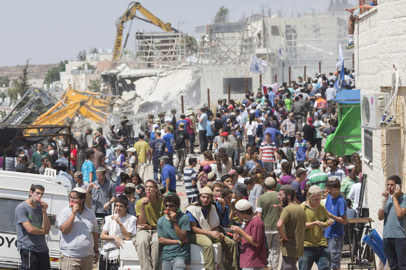 Israeli settlers watch as bulldozers demolish a building in Beit El settlement north of Ramallah in the occupied West Bank on 29 July, per an Israeli high court order.