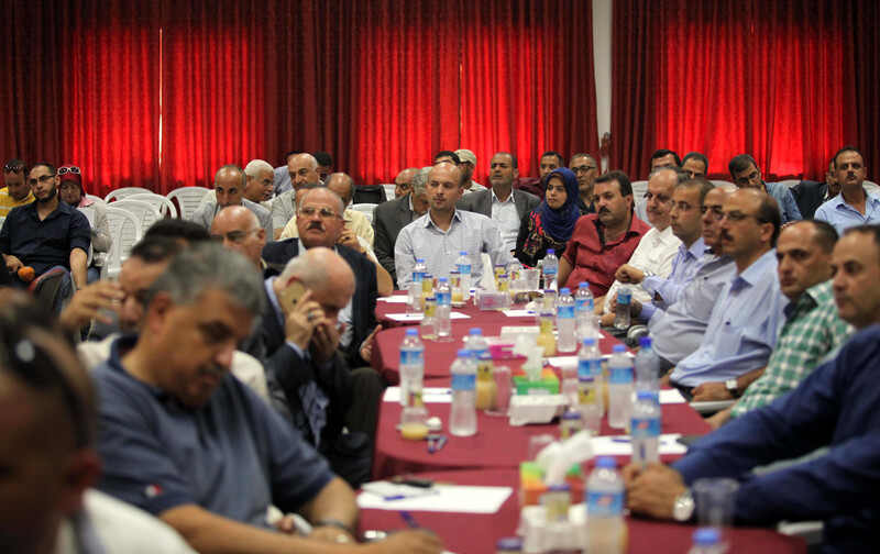 Palestinian businesspeople from the West Bank and Gaza Strip attend a meeting in Gaza City on 29 July. A delegation of 115 businesspeople representing private sector institutions in the West Bank traveled to Gaza to enhance economic and commercial cooperation between the territories, which are geographically separated by Israel and Palestinians are unable to travel between them without Israeli permission.