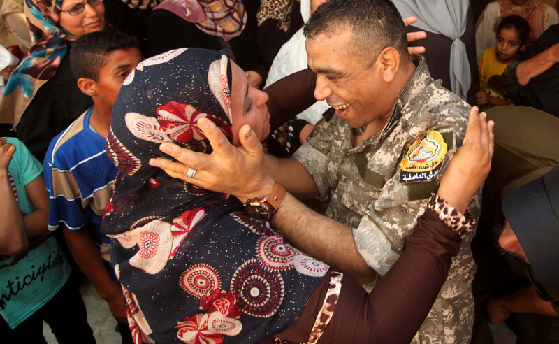 Mahmoud Abu Amra is welcomed by a relative upon his release from Israeli prison, Deir al-Balah, central Gaza Strip, 30 July. Abu Amra was imprisoned for 12 years after he was convicted of being a member of Fatah’s armed wing and for taking part in resistance against the Israeli army, according to his family.