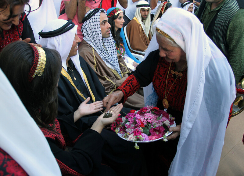Palestinians take a part in a traditional wedding in the West Bank town of Birzeit, near Ramallah, during the Rozana Cultural Festival, 26 June.