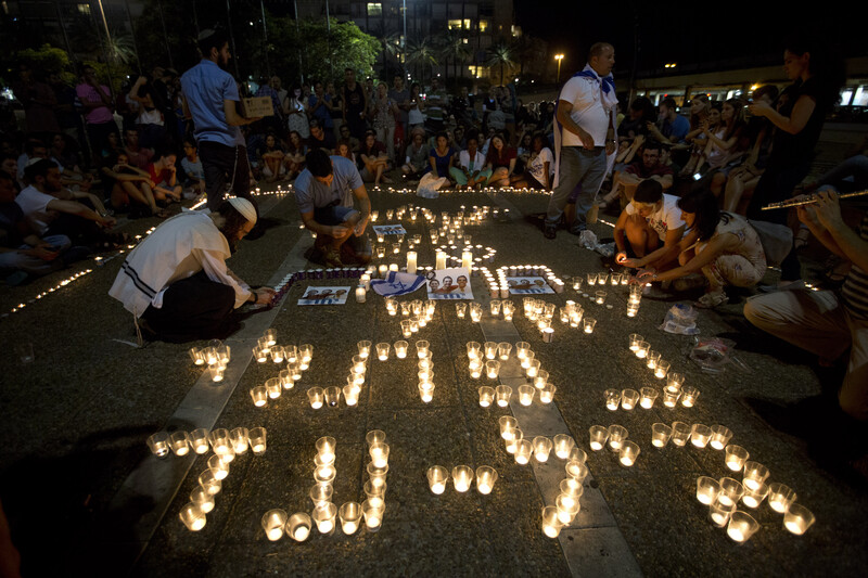 Israelis mourn three teenagers whose bodies were found in the West Bank earlier that day at a candlelight vigil in Rabin Square, Tel Aviv, 30 June.