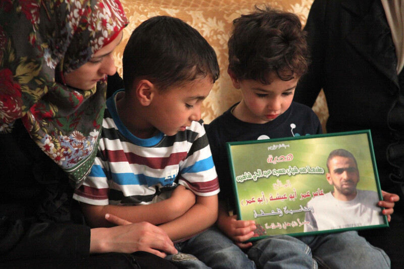 The son of Amer Abu Eishe holds his father’s picture as he poses with his brother and his mother for media in their house in the West Bank city of Hebron, 27 June. Israel named Abu Eishe as one of two men it suspects are behind the 12 June disappearance of three Israeli teenagers in the occupied West Bank. The teens’ bodies were found near Hebron on 30 June.