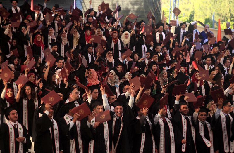 Palestinian students celebrate during their graduation ceremony at Birzeit University near the West Bank city of Ramallah, 26 June.