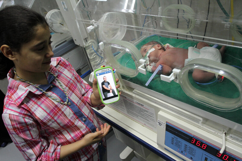 Aseel Khadoora, the daughter of Palestinian prisoner Saleh Khadoora (pictured in mobile), stands near her newborn brother at a Gaza City hospital on 26 June. Saleh Khadoora’s wife gave birth to male twins after being impregnated by sperm smuggled out of Israeli prison, a prisoners association said.