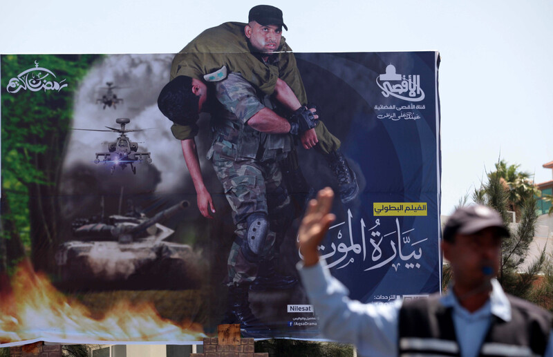 A Palestinian policeman in Gaza City directs traffic in front of a billboard depicting a Palestinian fighter carrying a kidnapped Israeli soldier, 17 June. A Palestinian action film to be shown during the month of Ramadan depicts the kidnapping of Israeli soldiers during an military operation in the Gaza Strip.