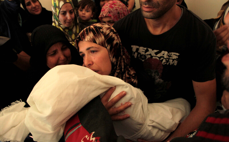 The mother of three-year-old Jud al-Danaf kisses her daughter during the girl’s funeral in Gaza City, 25 June. The girl was killed and three other family members were wounded when a rocket fired from Gaza fell short of Israel.