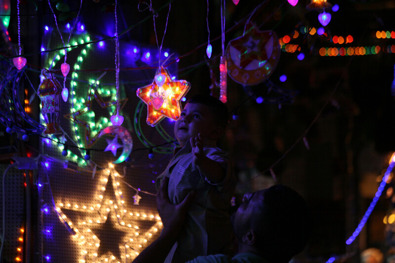 A Palestinian man and his son enjoy Ramadan lights decorating an alley in Jerusalem’s Old City during the first day of the month of Ramadan, 29 June.