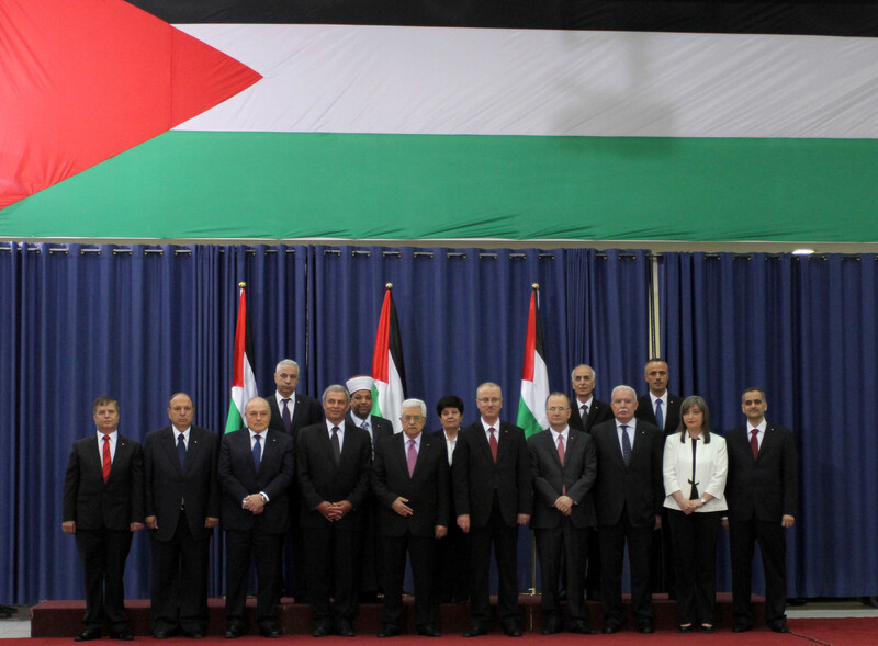 Palestinian Authority leader Mahmud Abbas poses for a picture with the members of the new unity government in the West Bank city of Ramallah, 2 June.