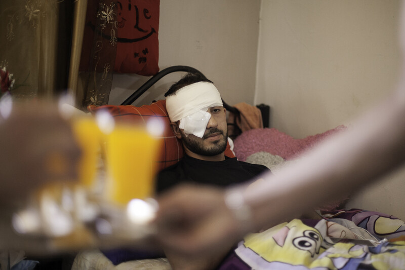 Malik al-Sharef, 21, recovers in his home in Dheisheh refugee camp as family members pass juice to visiting cousins, 22 June. The youth was shot with a plastic-coated steel bullet just above his right eye during a late-night army raid on the camp. Hundreds of soldiers descended upon the camp, arrested 35 residents and shot several others with rubber bullets and live ammunition.