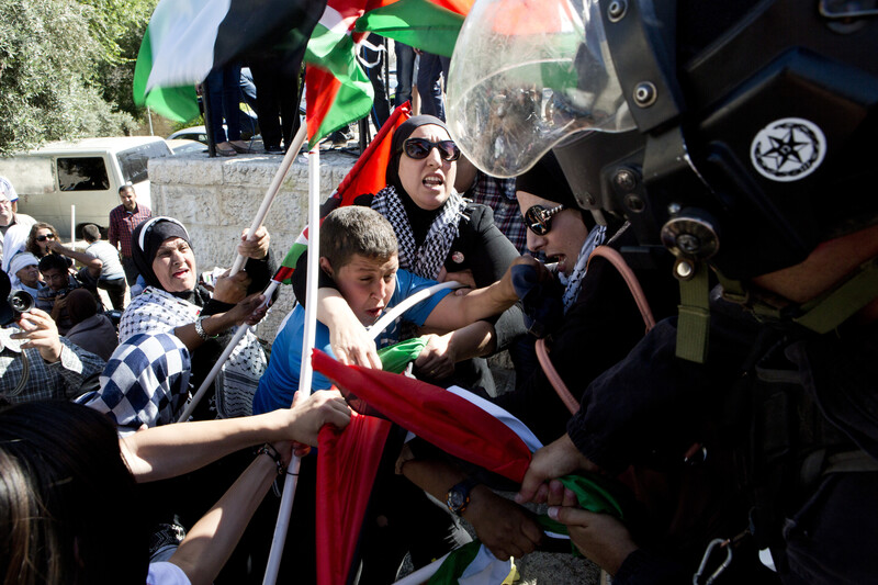 Hebrew University students, faculty and supporters (including Palestinian member of Israel’s parliament, the Knesset, Haneen Zoabi, shown holding sign) in occupied eastern Jerusalem hold a demonstration in solidarity with Palestinian Christian citizens of Israel who were recently sent voluntary draft notices encouraging them to enlist in the Israeli military, 7 May. Though army service will remain voluntary for the vast majority of non-Jewish Israeli citizens, the move is seen as an attempt to drive a wedge between Palestinian Christian and Muslim citizens of Israel.