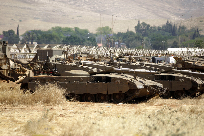 Israeli tanks stand on agricultural land during a military training exercise in the Jordan Valley on 6 May.