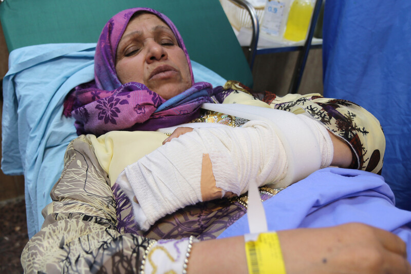 Yusra Qatesh, 60, rests in a hospital in the West Bank city of Nablus on 13 May after 24 hours of Israeli detention. Qatesh was detained by Israeli authorities at the Allenby crossing while she was traveling back from Jordan to West Bank before she was taken to a police station in Maale Adumim settlement. Qatesh’s hand was fractured after an Israeli soldier pushed her into a police car. She was hospitalized in Jerusalem by the police and then dropped off on a street near Maale Adumim.