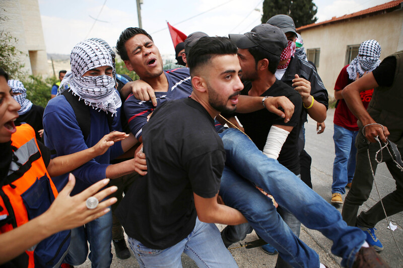 Palestinians carry a wounded protester during clashes with Israeli Border Police following a demonstration marking the 67th anniversary of the Nakba outside Ofer military prison near the West Bank city of Ramallah on 15 May.