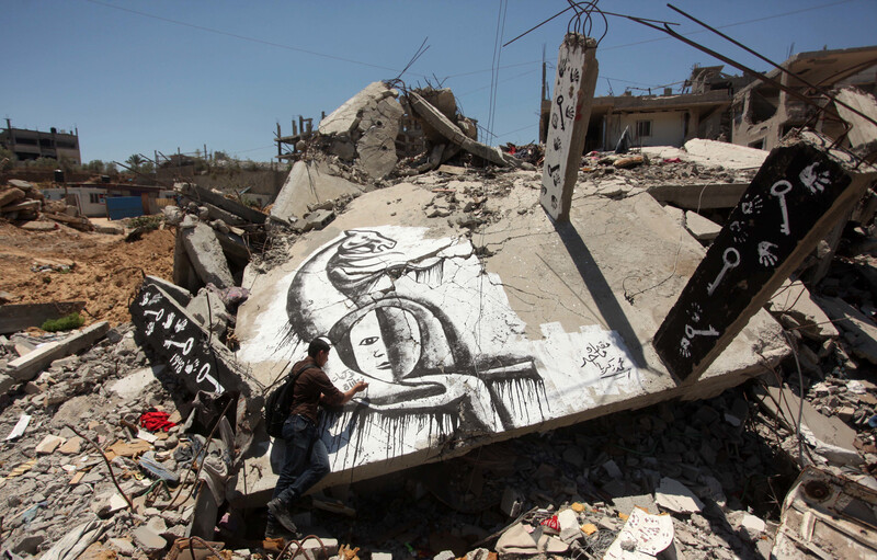 A Palestinian artist paints a mural on the rubble of a building following a march to mark the 67th anniversary of the Nakba in the al-Tuffah neighborhood east of Gaza City on 16 May.